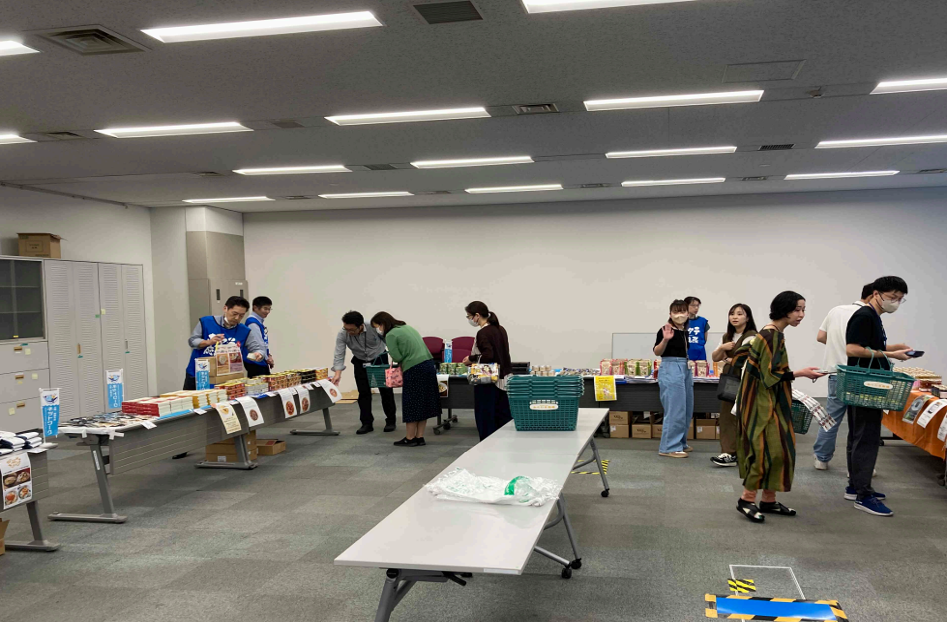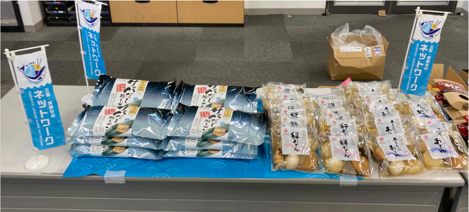 会場には、三陸産の鯖の味噌煮、浅炊きいわし、ホタテクリーム煮缶などのお総菜のほか、三陸の魚介類を使った燻り牡蠣・つぶ貝の煮付けなどのおつまみ、三陸産練り製品を入れた絆おでん、サバだしラーメンやなみえ焼そばなどの麺類、グリテンフリーのスナック菓子、福島県産のりんご・なしのジュースなど、多種多様な商品が並べられました。