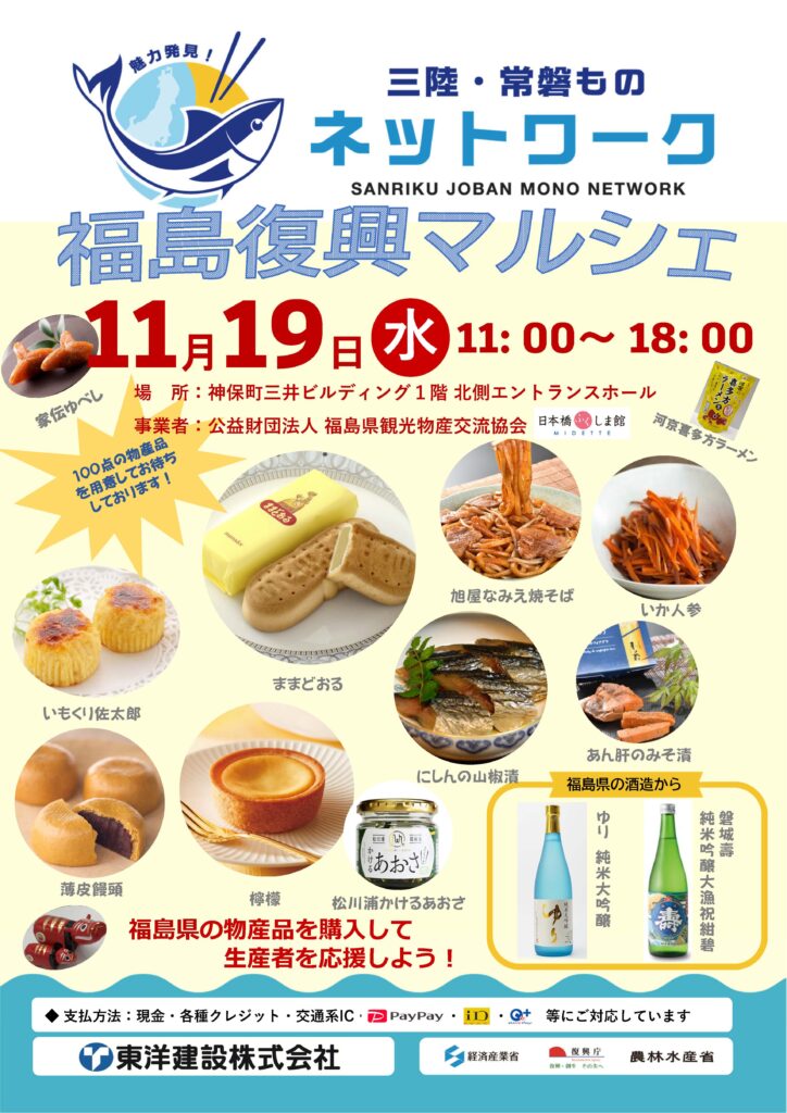 「魅力発見!三陸・常磐ものネットワーク」参加企業でございます東洋建設株式会社様主催の「福島復興マルシェ」が、11月19日(水)に開催されます。