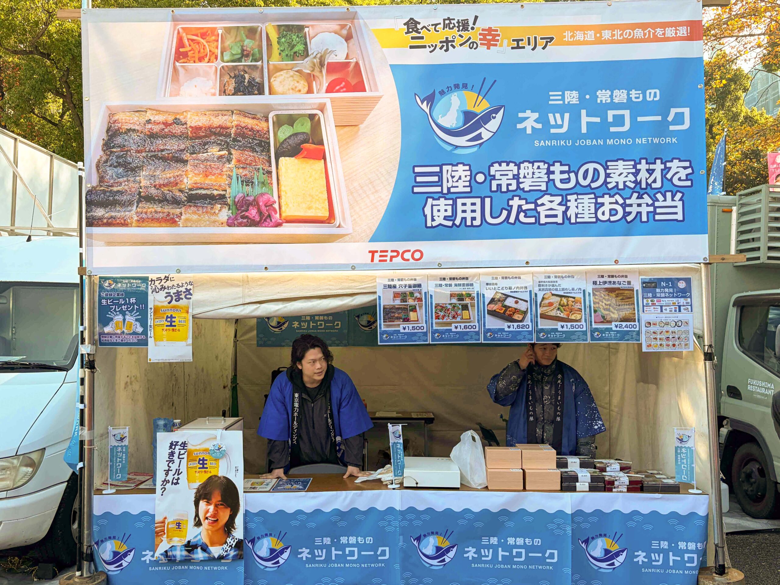 本ネットワークでは、ウィークス期間中の11月28日(金)~30日(日)に、東京都千代田区の日比谷公園で開催された日本最大級の魚介グルメフェス「SAKANA&JAPANFESTIVAL(魚ジャパンフェス)2025 in 日比谷公園」(主催・同実行委員会)に協賛しブースを出展しました。ブースでは、「三陸・常磐もの」を使ったオリジナルお弁当を販売しました。また、福島の復興応援を目的に県産水産物を使った魚介料理が味わえる「発見!ふくしまお魚まつり」(主催・同実行委員会)が同時開催されたほか、北海道・三陸地域の魚介料理を集めた「食べて応援!ニッポンの幸エリア」も開設。最終日には国産水産物料理のコンテスト「第11回Fish-1グランプリ」も同時開催され、「三陸・常磐もの」が味わえるブースが多数出店。約2万7000食が提供されました。