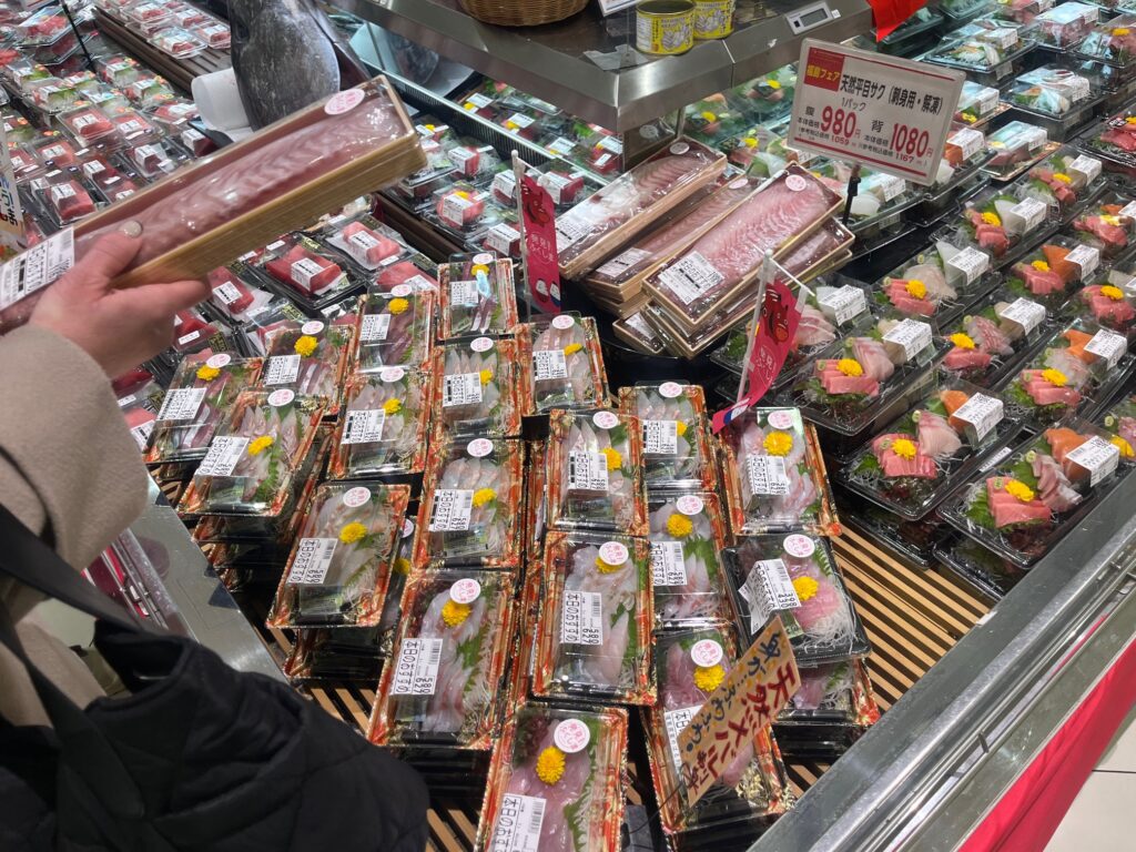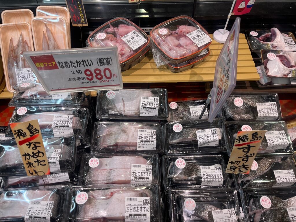 経堂店の鮮魚担当の西岡大和さんは「福島出身の当社のバイヤーの提案で、全社的に応援しようとフェアを企画しました。福島の魚は鮮度もよく、しっかりとおいしさを伝えていきたい」と説明。「チームめっけ~ず」のファンで埼玉県ふじみ野市から訪れた女性客は「いつもおいしく食べて応援しています」と、ヒラメの刺し身などを購入していました。