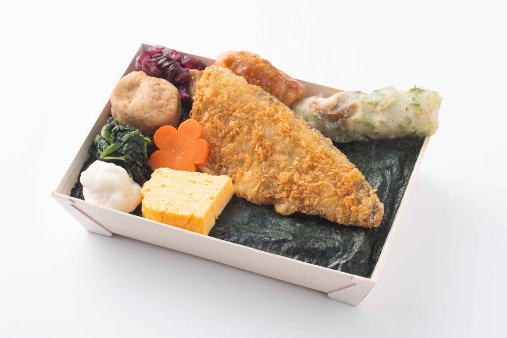 三陸銀鮭、福島県さんまのポーポー焼き、福島県岩下商店のさつま揚げ、金華鯖塩焼き、三陸カキフライと福島県や三陸のものがたっぷり詰まったお好み贅沢三昧なお弁当です。