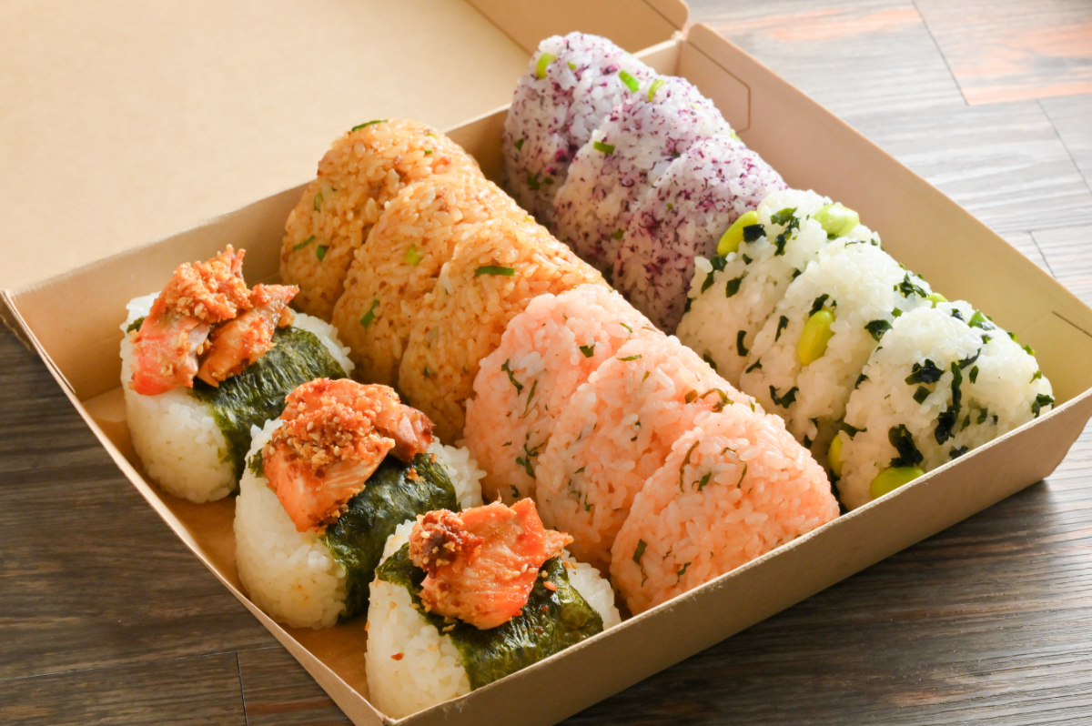品評会で金賞を受賞したゴマ醤油サーモンがおにぎりになり3個入ってます。 そのほかに4種類の当店自慢の手握りおにぎりが4種×3個入ってます。