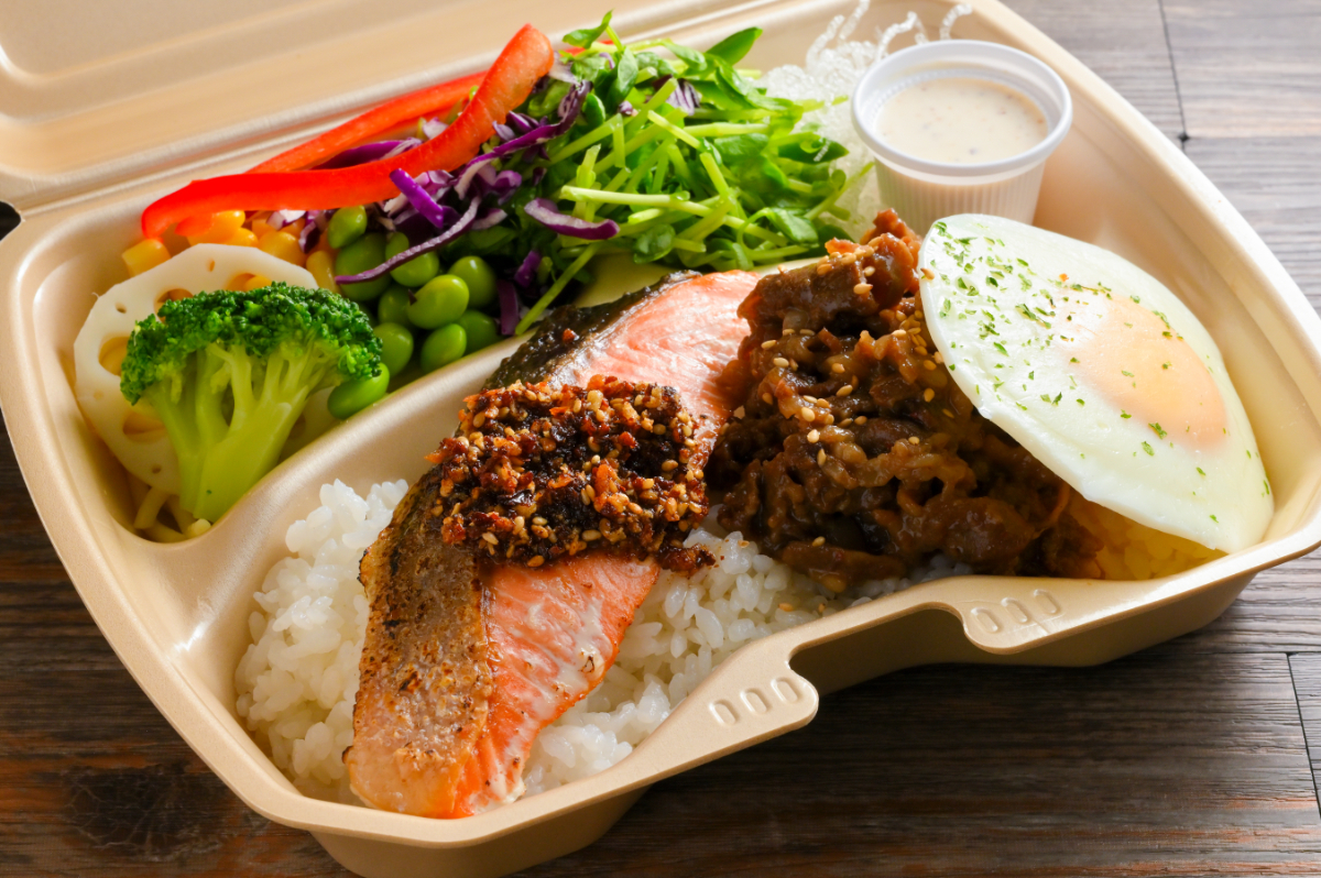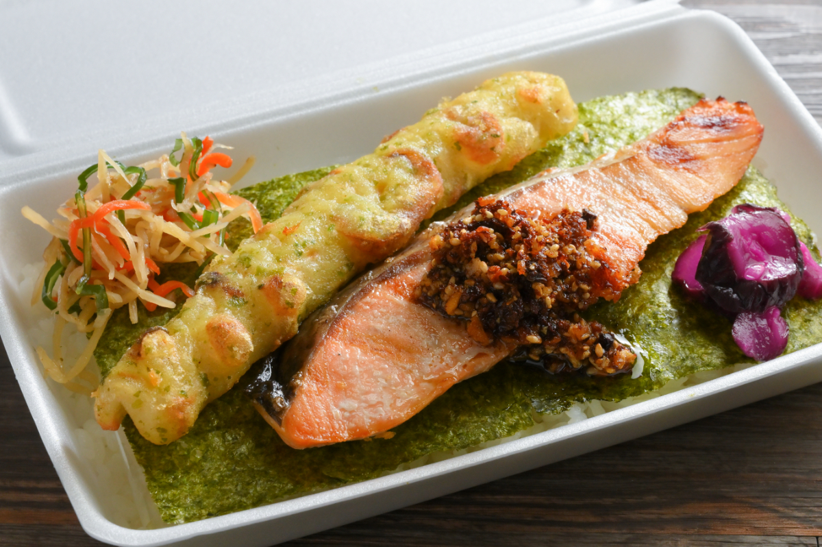当店人気No.1のザクザクごま醤油サーモンと、人気No.2の 特製焼肉が夢の共演。一度に両方楽しめる、スペシャルなお弁当です。サーモンは香ばしいごま醤油とザクザク食感がやみつきに。焼肉は特製ダレにじっくり漬け込み、旨みをギュッと閉じ込めて香ばしく焼き上げました。さらに8種類の彩り野菜(水菜・コーン・大根・アーリー玉ねぎ・紫キャベツ・レンコン・人参・ブロッコリー)で栄養も満点!※お野菜は日によって少し変わります。見た目も味わいも大満足の贅沢弁当、ぜひお試しください